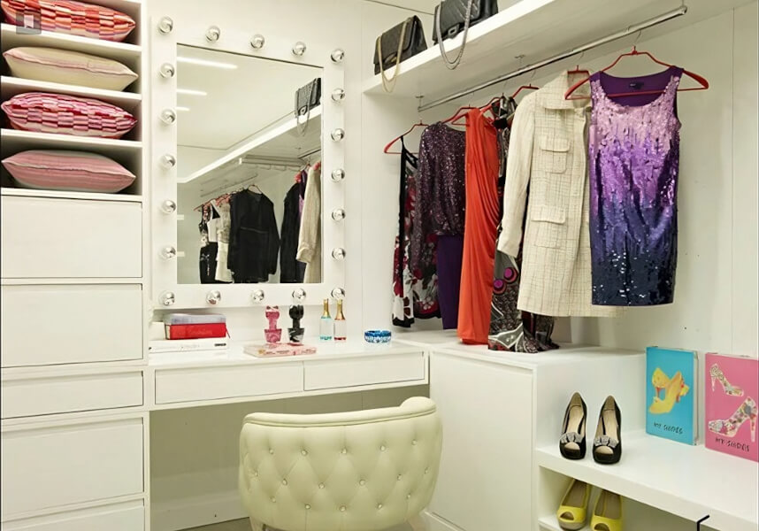 Расположите туалетный столик так, чтобы он стал естественным продолжением вашей гардеробной. Это может быть уголок у окна или часть, выделенная в зоне хранения. Убедитесь, что к нему удобно добираться.
